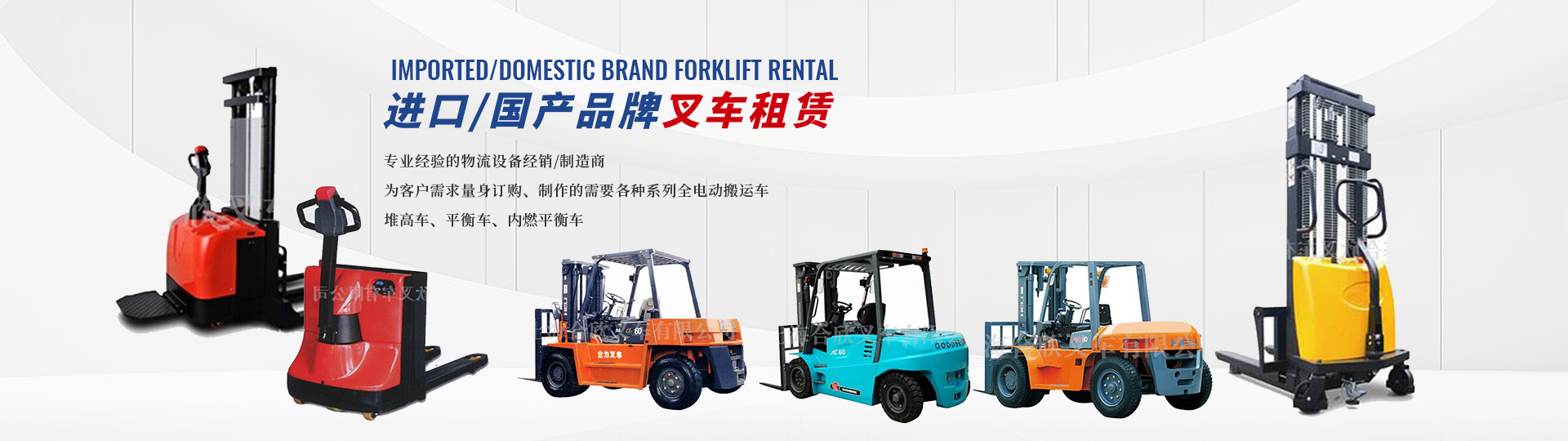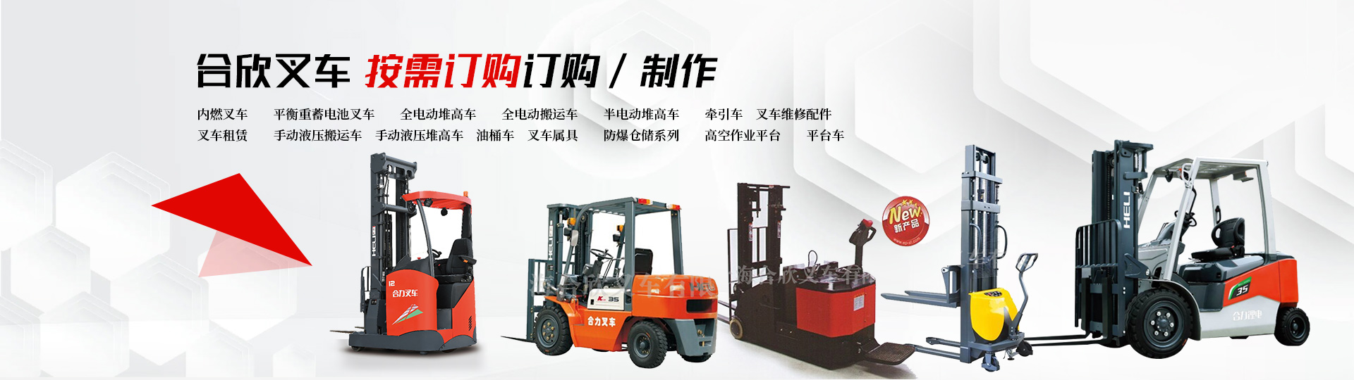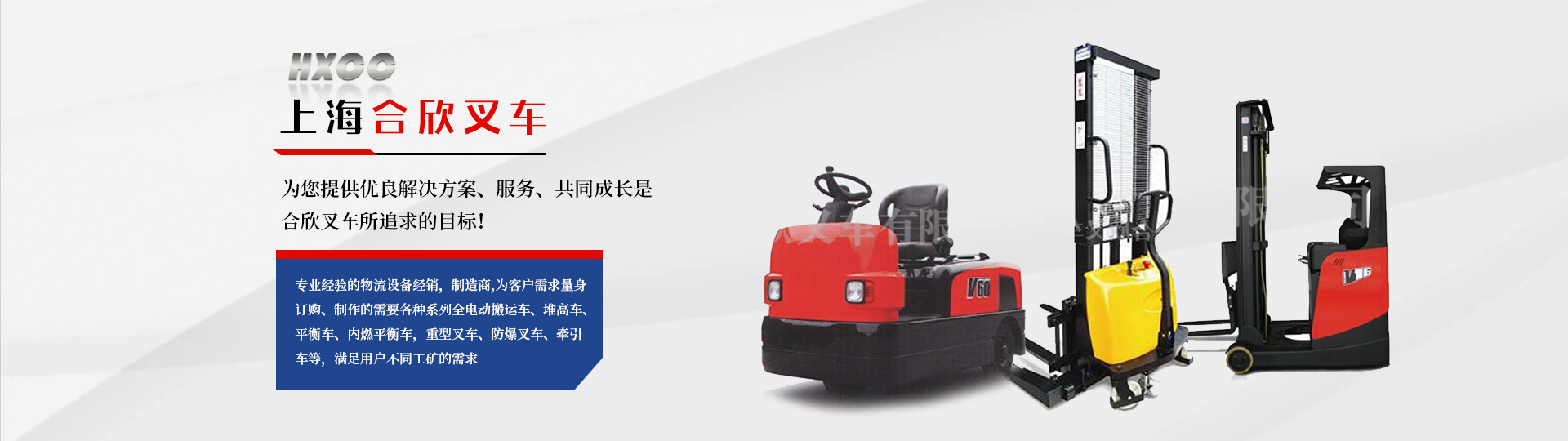 上海合欣叉车有限公司是一家专业从事进口、国产品牌叉车租赁、高品质返流车租赁、物流设备项目服务整包,叉车维 修服务、叉车配件、整机销售,叉车后市场的综合服务, 秉着专业经验的物流设备经销,制造商,为客户需求量身订购、制作的需要各种系列全电动搬运车、堆高车、平衡车、内燃平衡车,重型叉车、防爆叉车、牵引车等,满足用户不同工矿的需求 ,无论您需求的是任何举升高度 行驶路况和行驶距离, 都能为您提供佳解决方案、服务、共同成长是合欣叉车所追求的目标!